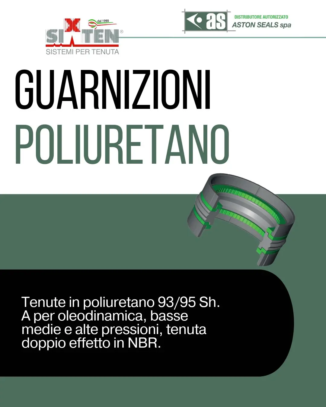 • Poliuretano (PU): eccellente per applicazioni dinamiche, alta resistenza ad abrasione e estrusione, tipico per tenute stelo/pistone oleodinamiche.
